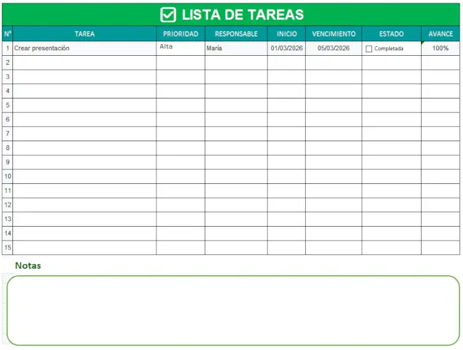 Hemos preparado una plantilla profesional de lista de tareas en Excel con todas las funciones descritas en este artículo: formato condicional, listas desplegables, panel de resumen y más. Lista para usar en 30 segundos. Descargar plantilla gratis